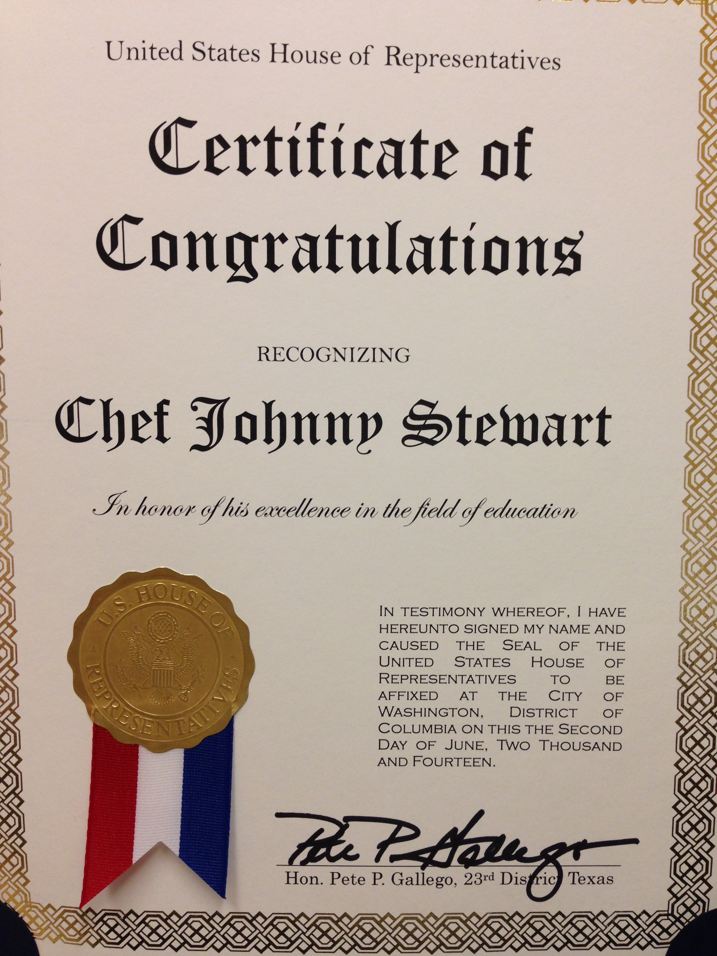 In May I was surprised by Congressman Pete Gallego. I was told that he wanted to tour my facility and meet my students. Actually he was there to present me with and award and take a tour. After the tour he presented me a Certificate of Congressional Recognition for the work I do at McCollum High School with my Culinary Arts students.