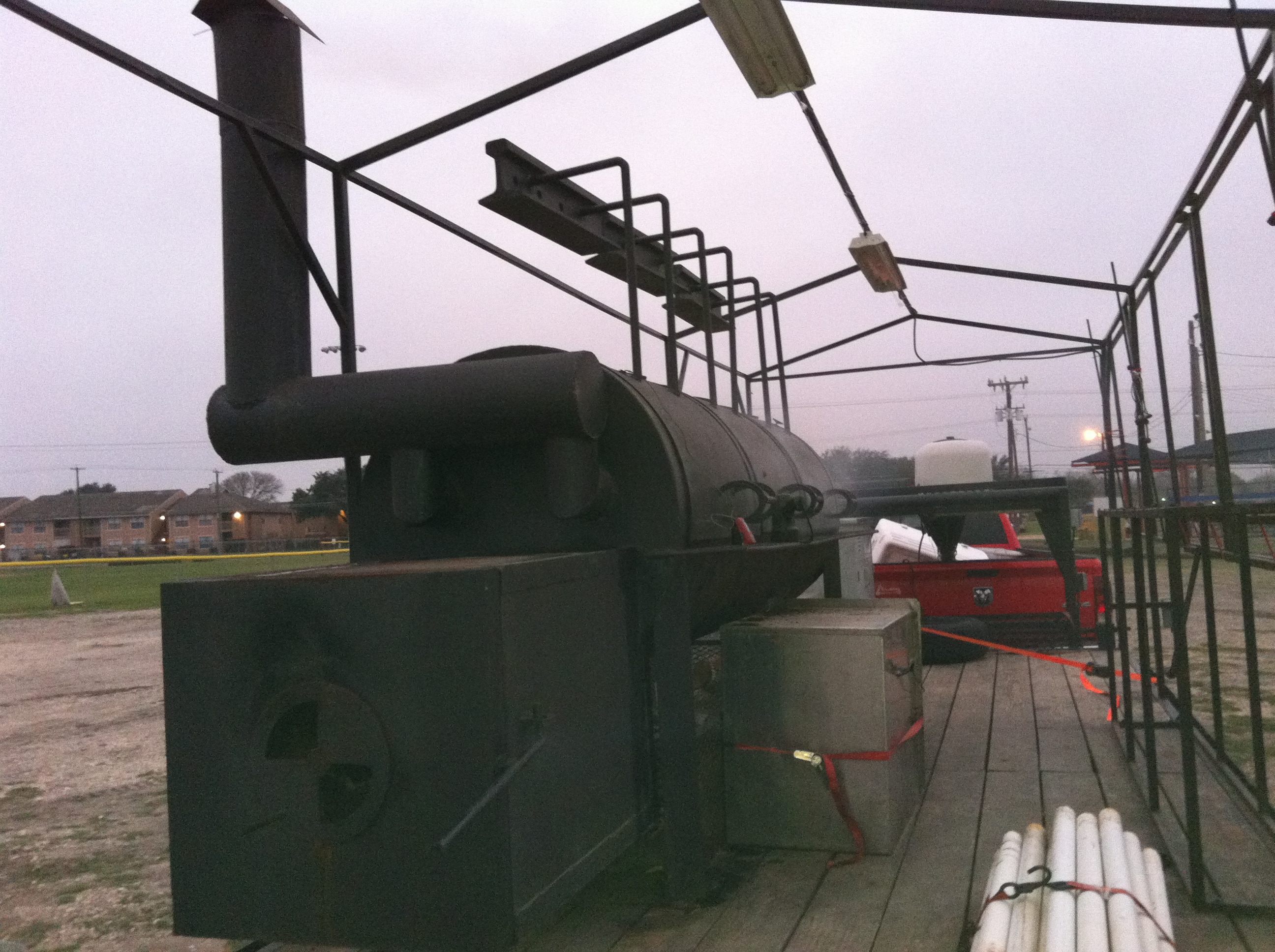 This is my reverse flow pit. My nephew and son helped me make it about four or five years ago. The cooking chamber is about 9’X3′ and will cook 30 briskets at one time and has an insulated fire-box. The pit is setting on a gooseneck trailer that has a 24′ deck with two 5500lb axles. I have a 50 gallon water tank on the neck that is connected to a sink and a 55 gallon grey water tank. I also have installed an aluminum tool box for storage. When you fold out the side braces a 12’X24′ tarp will attach to it with bungees. I did not want to cover it in metal so it would not be so hard pulling down the road. The red BBQ Vaults have been removed. my plan was to install a steak grill where they were. I am asking $12500, but the price is negotiable.