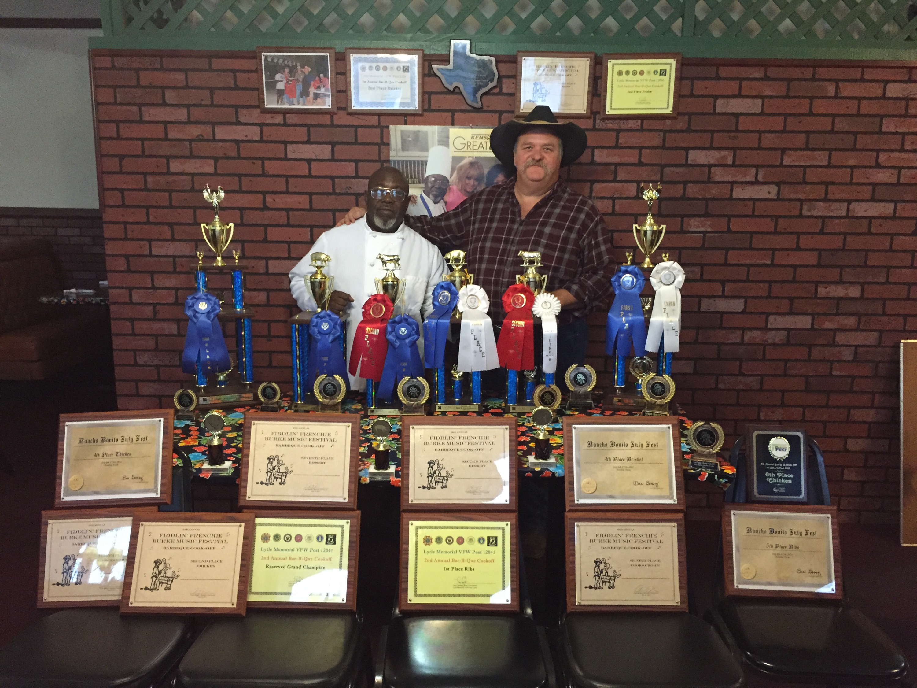 Fernando and I started our BBQ team five years ago Pappy joined us two years ago. Here is Pappy and I with a little over half of our awards. We have 65 awards in five years they include Grand Champion, Reserve Grand Champion. and top 10 finishes.