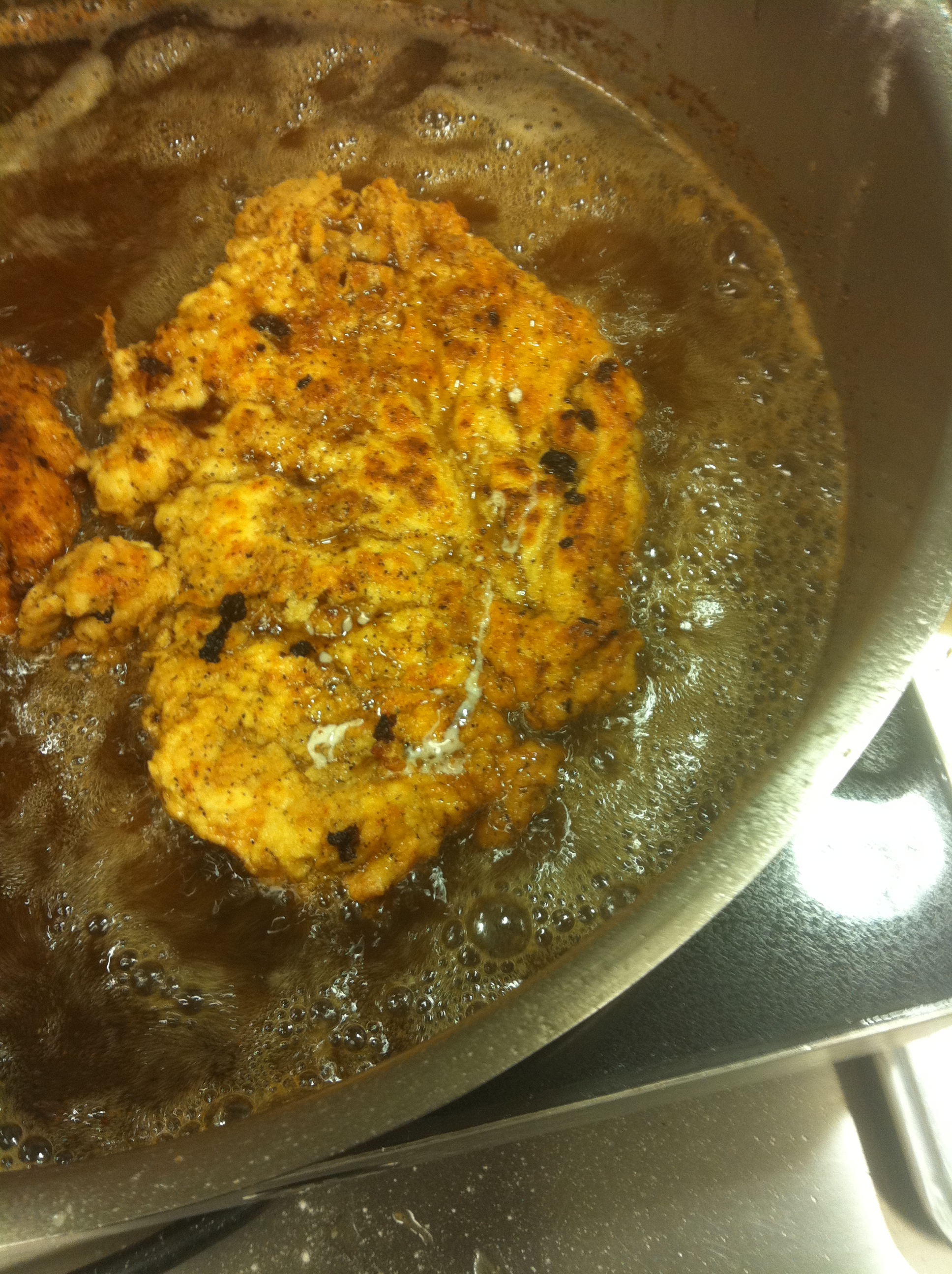 - Place breast in skillet of hot oil to cook. The oil should be deep enough to cover 2/3rds of the chicken breast.