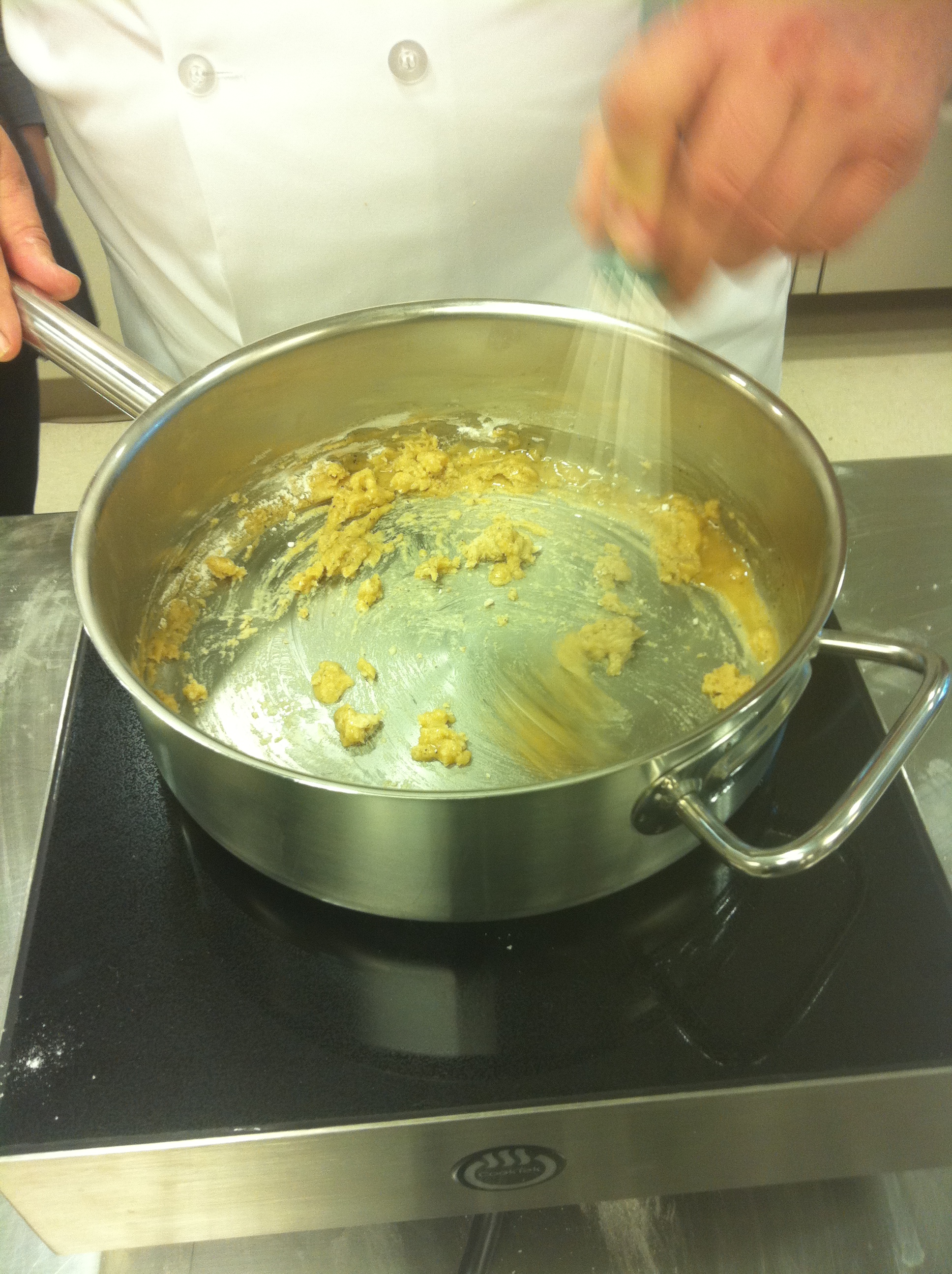 - Place oil and flour in skillet heat and mix to form roux. (for a proper roux mix equal parts of fat to flour by weight)