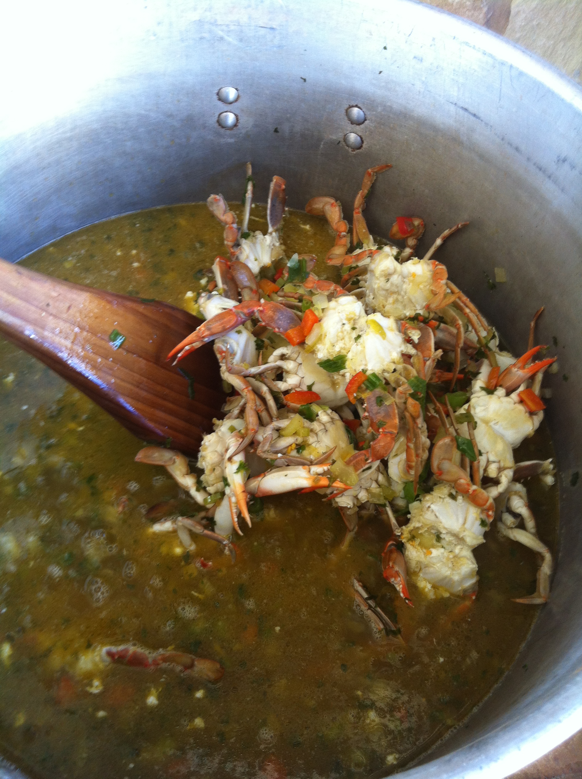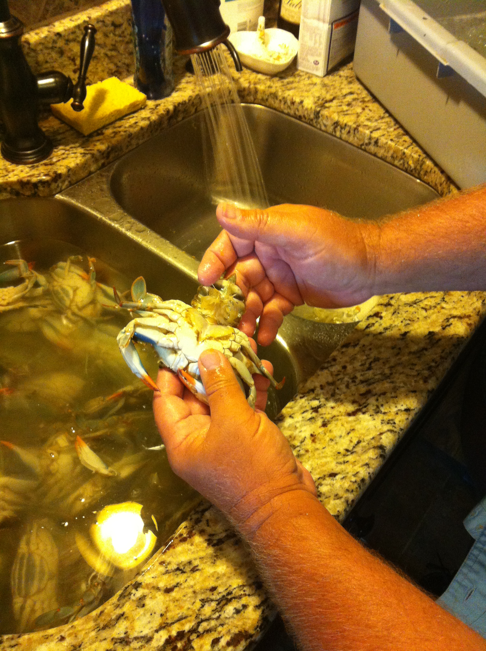 It is best to use the crab fresh, but I was about 4 days out from using them. There are different ways to handle crabs, you can cook them whole and freeze them, cook them and then pick the meat out and use it or you can freeze them whole. I chose freeze them whole since I was using the whole crab in the stew. I pulled the crab out of the freezer on Friday to let them thaw in the frig. Early Saturday morning John and I got up and started cleaning the crabs. Crab can spoil very quickly so we were very careful when processing them.