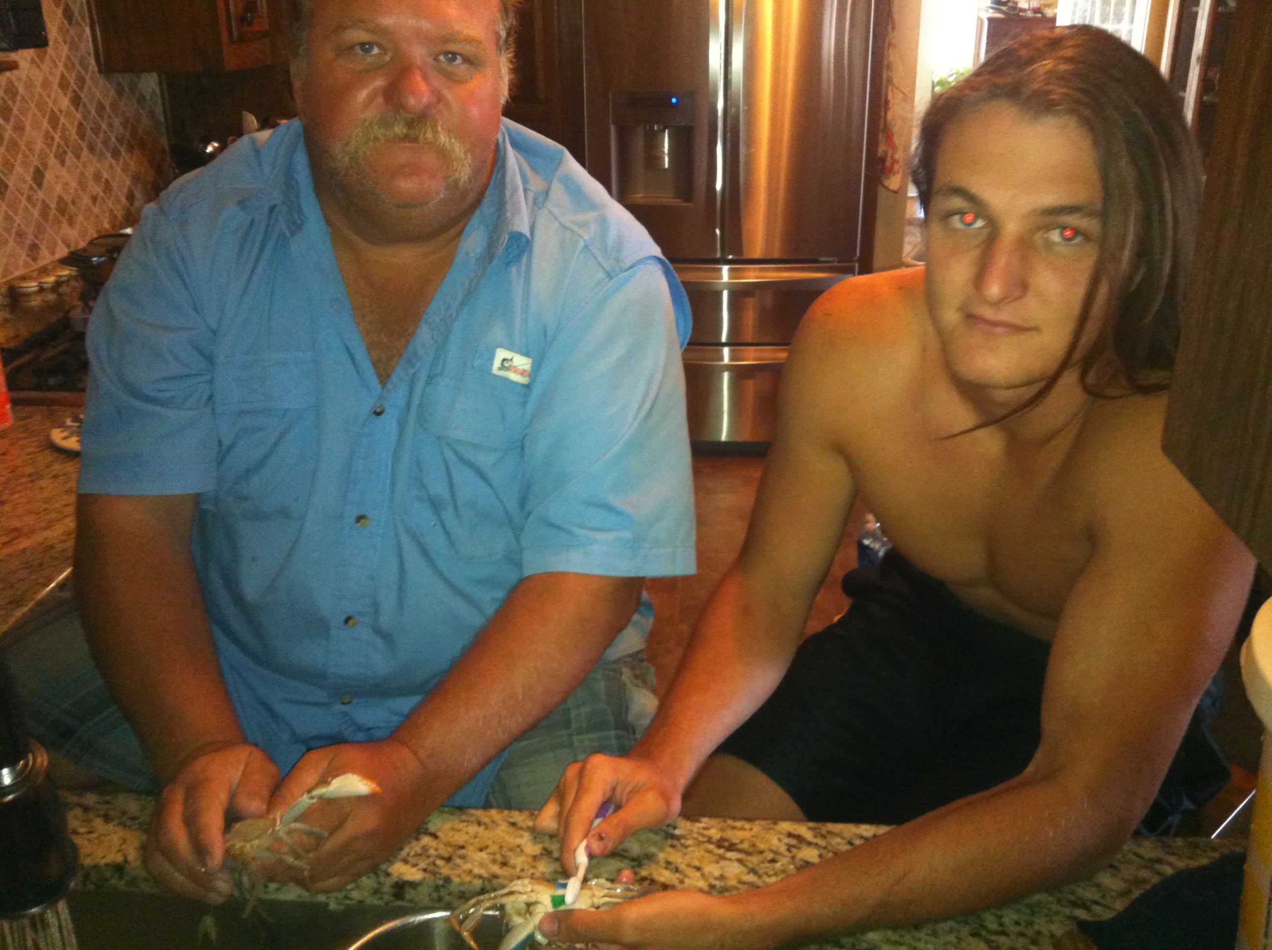 John scrubbing the shell with a stiff brush and removing the abdominal plate then I removed the carapace and cleaned the inside and placed it in ice to protect freshness.