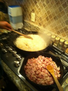 After cleaning the crabs they were put on ice. Then we started the dicing of vegetables. We had celery, onions, red bell pepper and parsley. We fried up 2 lbs of bacon for the grease. We used the bacon grease along with vegetable oil to make the roux. I wish I had pictures of the finished roux, it was the color of a new penny. My Aunt made the prettiest roux I have ever seen.