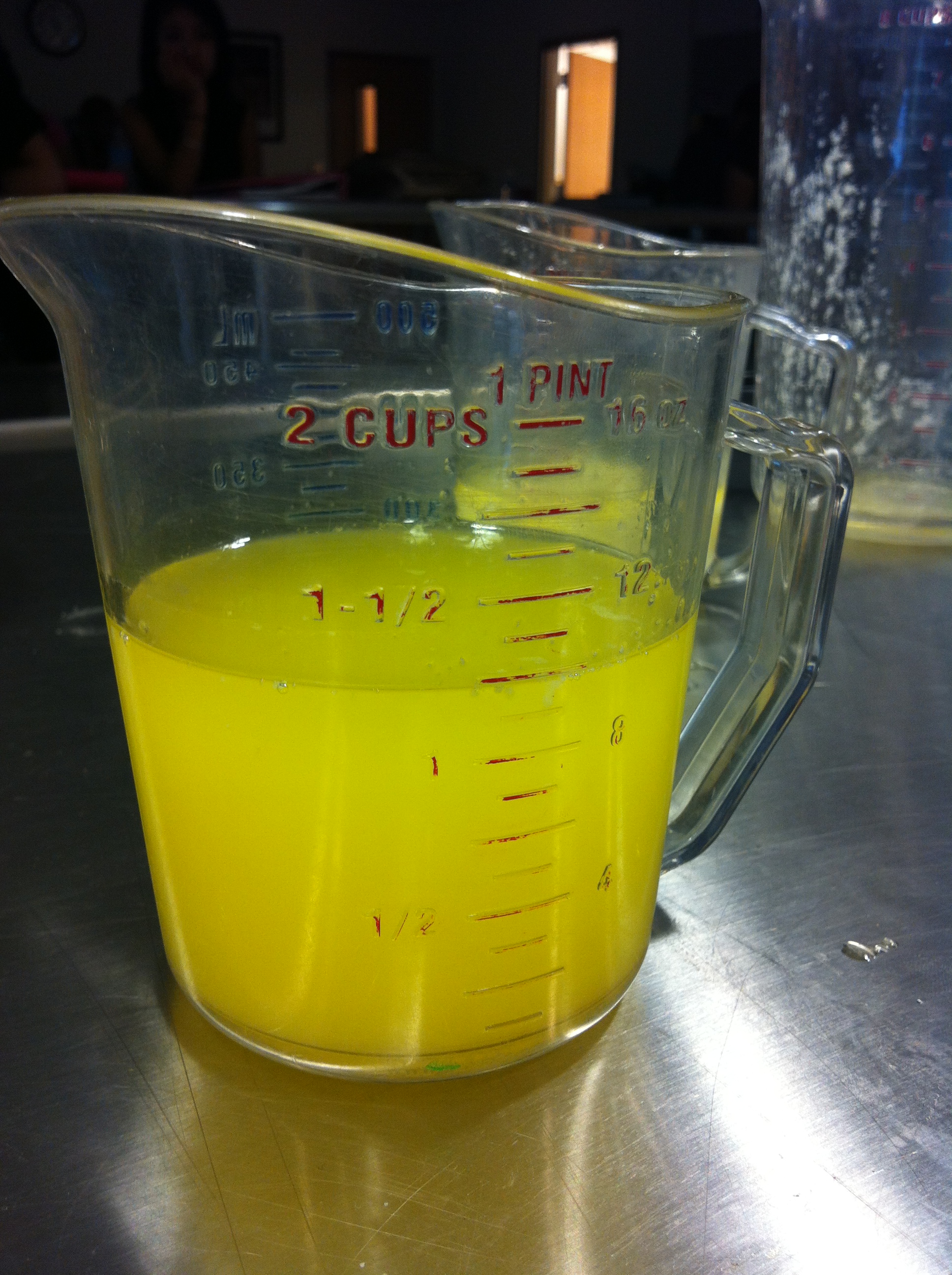 2. Remove items that are floating on the top and pour off the middle, which you will keep.