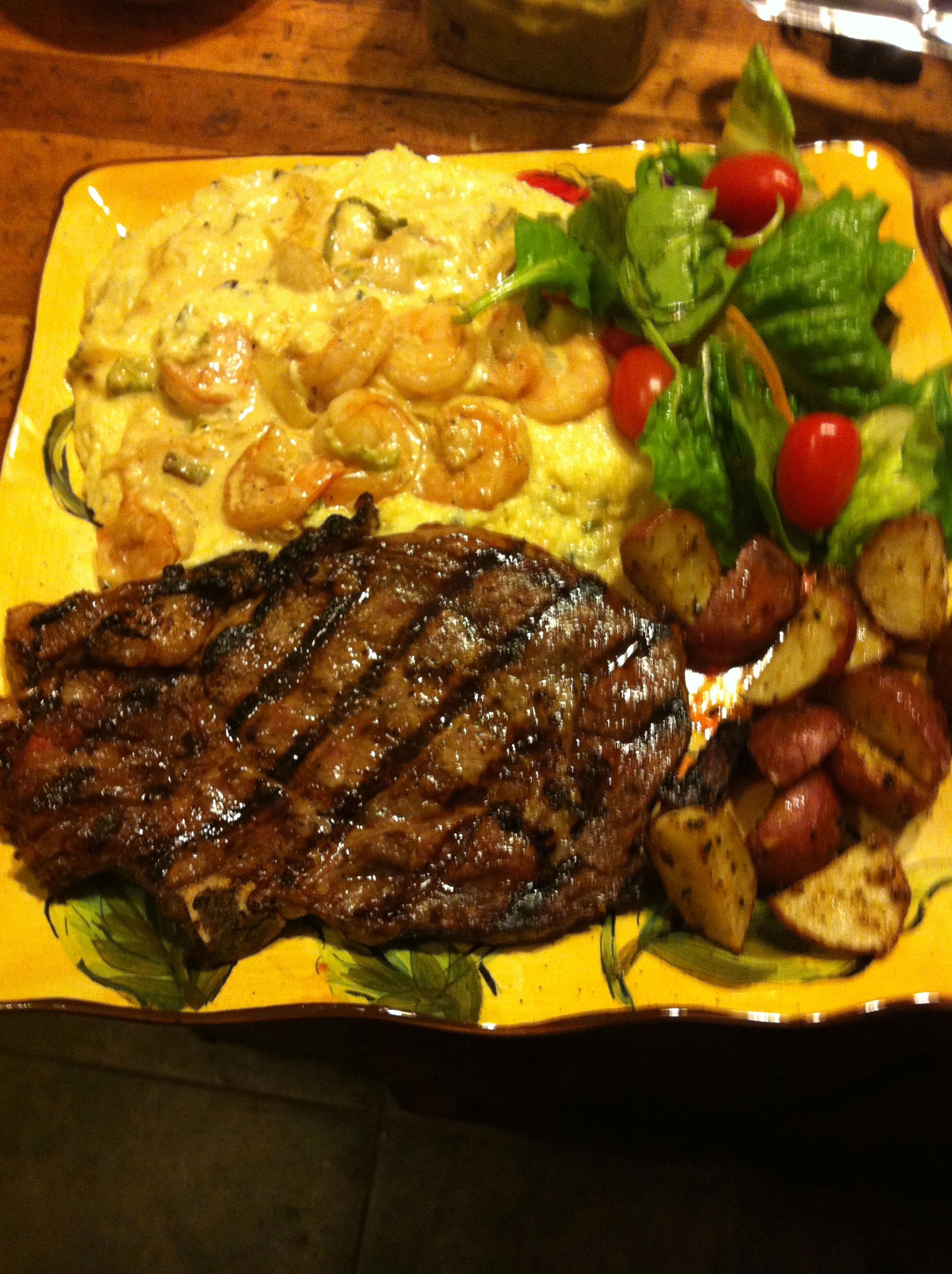 I served the grits with sautéed shrimp, that were cooked with slivers of onion and Anaheim chilies. the entrée was a grilled rib eye. The grits were and excellent addition to this surf and turf meal.
