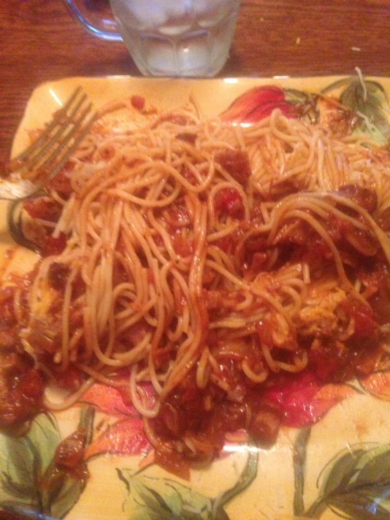 I had always heard about it and wanted to try it while in Memphis, the the opportunity to try it never arose. So the other night I decided to give it a try. My wife thought I had lost my mind, but I talked her into trying it. Of course I had to promise to fix her something else if she did not like it, shock she was certain she would not. Well I must say she was wrong, it was a huge hit. The sauce was a deep red savory sensation that I used the left over pork butt that I smoked last weekend. I served it over some al dente spaghetti noodles , with a side salad. This is a recipe that will be used again and I hope y’all enjoy it.