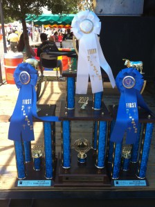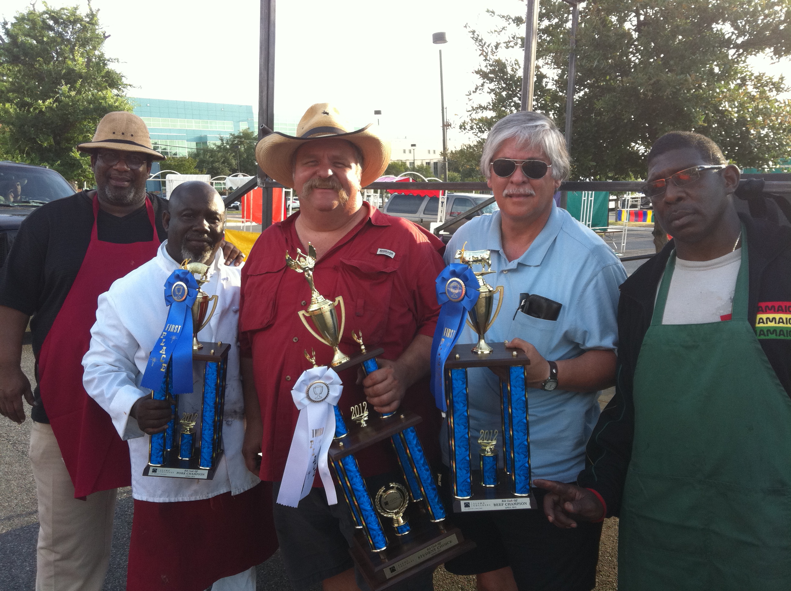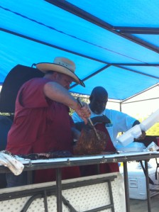Fiesta in San Antonio is a huge celebration. It is 100 different events over 11 days in late April every year. One of the annual events is the Culture Fest Rib Cook Off hosted by St. Philip’s College. I had entered a few years ago and really enjoyed myself with a 3rd place finish. It took very little convincing to get Bar Cross to enter it this year. We decided to enter both beef and pork ribs and to sell plates. I made a run to Restaurant Depot and picked up 30 slabs of spare ribs and six slabs of beef. We usually never cook beef ribs so we practice on a few racks prior to the cook off and came up with what we would be a good recipe. We have been working on some new recipes so we decided to enter two teams, Bar Cross and Bar Cross Too. We got to St Philip’s around 3:30 and started the fires. The pit was warmed up and cruising about 250º so we loaded up the pit with 30 slabs of pork and 6 slabs of beef that had already been rubbed the day before. About 10:45 we turned in our competition ribs. Team 1 turned in our sweet pork rib recipe and some spicy beef ribs. Team 2 turned in some spicy pork ribs and sweet beef ribs. Soon as we turned in we started selling plates. $5 would get you potato salad, borracho beans and a nice juicy rib. We had a good line of people buying plates when we were called for the awards ceremony. We were busy and did not go so they sent for us again. This time my cousin Fernando went to represent our team. The rest of us continued selling plates. in about 15 minutes we hear Fernando calling. We spot him coming through the crowd with his arms full of trophies. He yells out “We Won It All”. He was not kidding. We won 1st place beef ribs, 1st and 3rd place pork ribs and the Student Choice Award. Not a bad day. From the time we were announced as the winners we had people in our line until 1:30 when we ran out of ribs. Then we started selling sausage plates until they were all gone. So by 3:00 we had won every 1st place and sold out of food. Also we had a chance to try out the pit since we had moved it to the new trailer and made a few changes. It all worked out and we had a great time. St Philip’s did an excellent job hosting the event. We got to meet many of the Fiesta dignitaries, the president of Fiesta, the President and some of the deans from St. Philip’s and King El Rey Feo. We also wound up on TV here in San Antonio. WOAI TV 4 came by for a live shot for their morning show, and David Sears from KSAT 12 dropped in and tried some ribs while filming the trophies. It was great fun for us and we made good money selling plates, we just did not bring enough. But next year we will know and we will bring twice as many ribs.